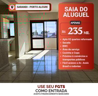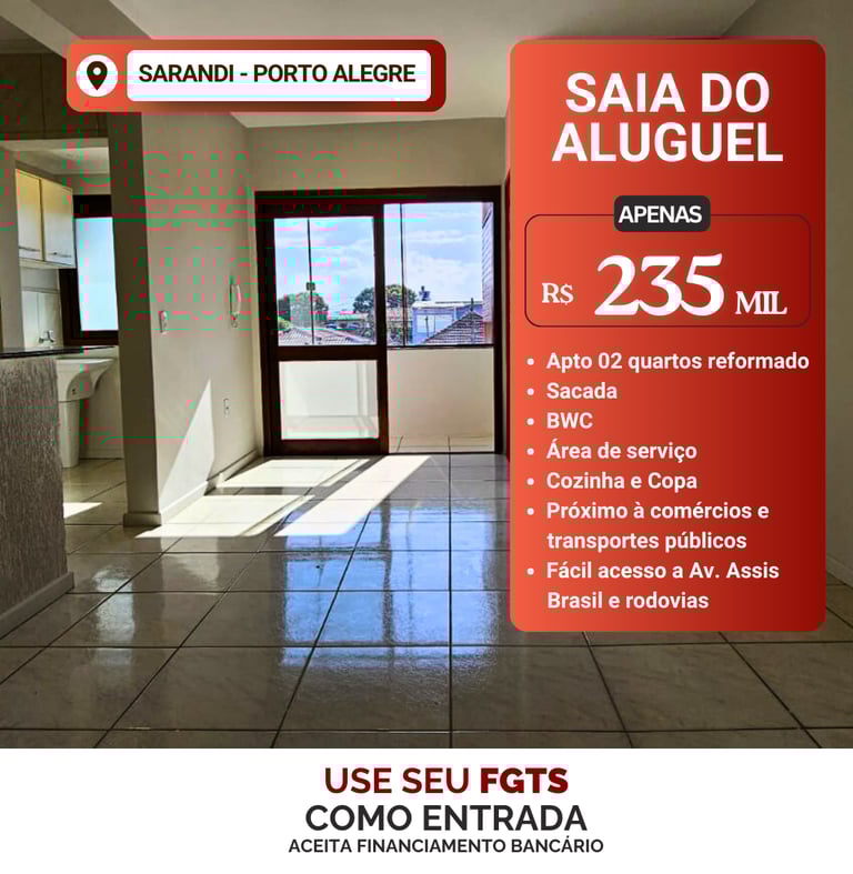 Este apartamento no bairro Sarandi, em Porto Alegre-RS, é perfeito para quem deseja dar o próximo passo e conquistar o sonho do imóvel próprio. Com 2 quartos, sacada e recém-reformado, ele oferece conforto e um espaço acolhedor para chamar de seu, por apenas R$ 235.000,00.
